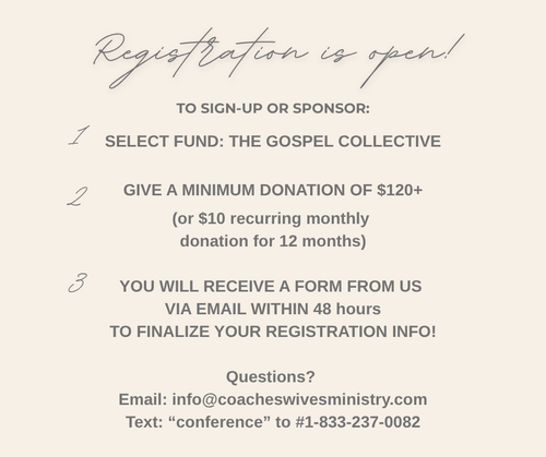 Different coaches' wives will be sharing about the transforming love of Jesus, covering topics like: the gospel & anxiety, the gospel & marriage, the gospel & parenting, the gospel & suffering...